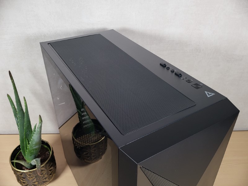 I/O’s: twee keer USB 3.0, audio en twee knoppen voor de RGB-controller en power. Jammer is dat Antec geen USB Type-C aansluiting erbij bedacht heeft, iets wat je ondertussen wel kan verwachten bij een beetje ATX-behuizing. Verder zit er boven de kast een magnetisch stoffilter, altijd handig.