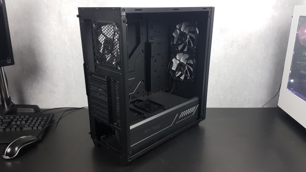 De strakke lijnen van de behuizing zijn gelijk goed zichtbaar. Het glazen zijpaneel wat de hele zijkant omvat ziet er erg goed uit en is net aan donker genoeg om de binnenkant deels te verbergen, had net een tint donkerder gemogen. Overigens is het paneel met vier eenvoudig te verwijderen schroeven los te maken. Pas op dat je de schroeven niet vergeet terug te plaatsen wanneer je het paneel weer wilt monteren, ik heb die fout gemaakt en het ging net aan goed.