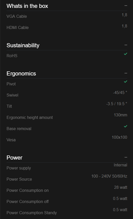 De 144Hz / 1ms combinatie verklapt al dat we het over een TN paneel hebben, tot zover de prijs dat nog niet duidelijk had gemaakt. Menig spec leggen we naast ons neer zoals dynamic contrast ratio, maar het is wel prettig om vast te stellen dat liefhebbers van compacte 24” schermen hier toch goed zitten, veel smaller komen ze niet. Ook de 400cd/m2 helderheid valt op, dat is best hoog.