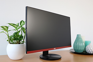 Ik kan de AOC G2590PX niets anders dan een ret… sorry: ‘erg strak scherm’ noemen. Van bezels is bijna geen sprake, de voet is strak en lekker klein, en eigenlijk het enige wat ‘gaming’ verklapt is het rode randje. Het is in elk geval no nonsense, en ook de vrij matte coating valt vlot (positief) op. De ‘less is more’ approach hoor je mij in elk geval niet over klagen, het geeft sowieso een heel ander alternatief dan wat ze met de Agon lijn aanbieden.