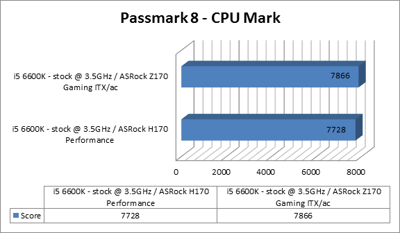 Hieronder nog een overzicht van het stijgingspercentage per benchmark. Hier is het zeker niet onbelangrijk om het volgende te vermeldden: de Performance scoort bij alle benchmarks minder dan de ASRock Fatal1ty Z170 Gaming-ITX/ac. De i5 6600K draait stock bij beide borden, maar in mijn Gaming ITX review is te zien dat standaard de BLCK hoger draait. Dit is de reden dat de Gaming ITX iets betere scores neerzet. Als we de resultaten zouden vergelijken op een standaard BLCK van 100 zullen de verschillen klein tot gelijk zijn.