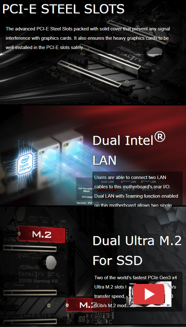 De trend in Z370 land begint inmiddels duidelijk te worden: monochroom. Op zich de veilige optie wat build compatibiliteit betreft, maar maakt het ook lastiger om onderscheid te maken, zeker nu zilverkleurige versterkingen van bijvoorbeeld de PCI-e sloten en soms DDR sloten de standaard beginnen te worden. Onderscheid zien we volgens mij echter nog wel meer dan genoeg met bijvoorbeeld het heatsink design, de gespoten patronen op het bord zelf, en ondanks het toenemend aantal overeenkomsten zijn alle bordjes in mijn optiek nog voldoende eigenzinnig. En even los daarvan, volgens mij genoeg visueel geweld.