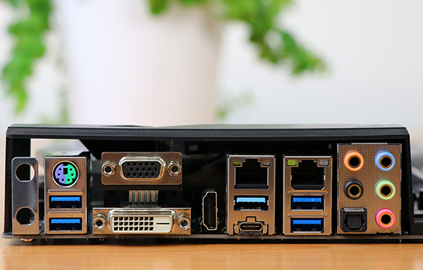 I/O is wat opvallend, met de genoemde gaten voor de antennes als je een WiFi module zou kopen, een ps/2 connector voor je randapparatuur, een DVI, HDMI en zelfs een VGA connector, de dubbele netwerkpoort, maar dan eigenlijk maar een beperkt wat type-A USB’s betreft met vier USB 3.0 poorten en een een USB 3.1 header, al is de zesde type-C wel fijn en ergens ook wel logisch in 2017.