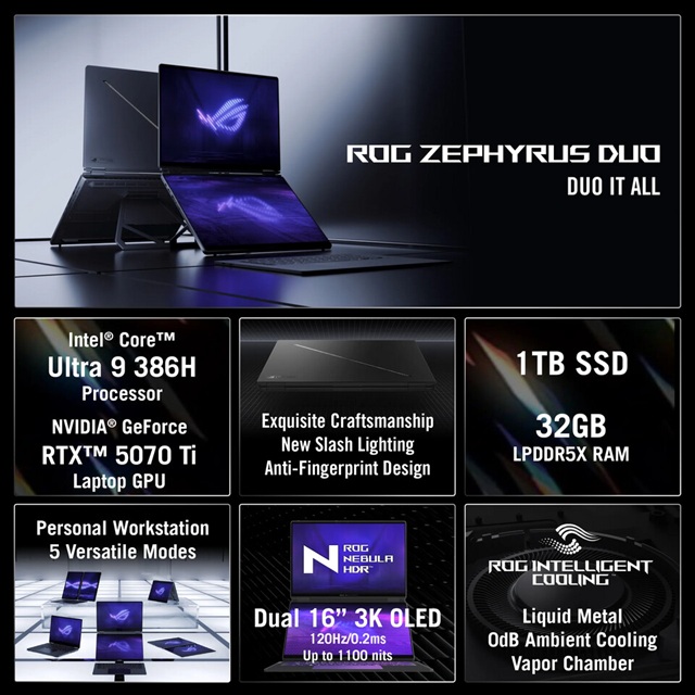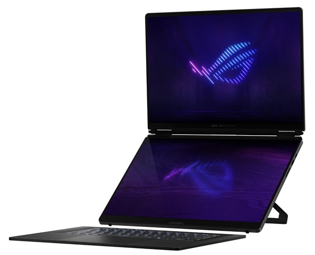 Het ontwerp omvat een CNC-gefreesde aluminium behuizing en een afneembaar magnetisch toetsenbord dat ook draadloos via Bluetooth gebruikt kan worden. Met meerdere gebruiksmodi, waaronder een uitgebreide dual-screen opstelling, biedt de Zephyrus Duo flexibiliteit voor uiteenlopende scenario’s.