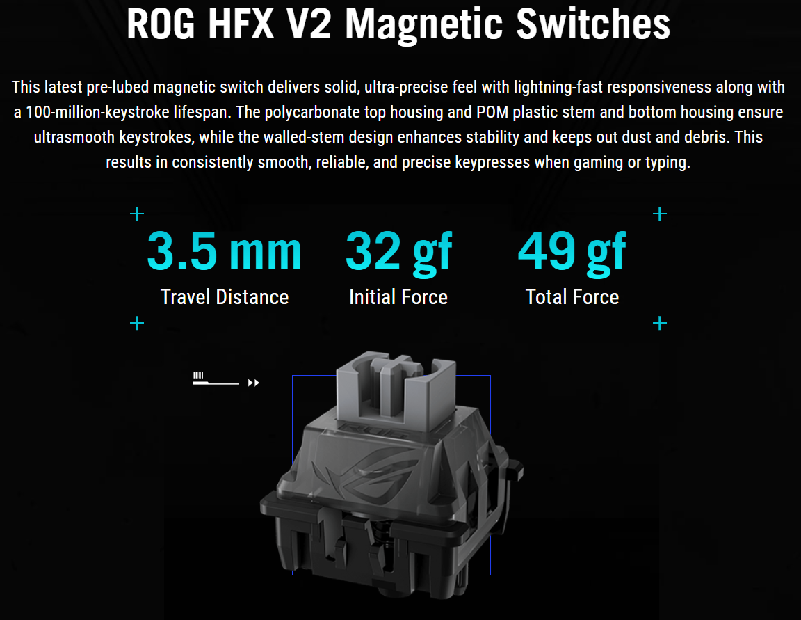 Positief vinden we de nieuwe ROG HFX V2 switches. Deze zijn magnetisch en daarmee instelbaar naar eigen wens. Echte (rode) speed switches liggen mij niet, maar deze nieuwere magnetische units kan je lekker afstellen naar eigen wens. Dat maakt het ook een stuk eenvoudiger aan te raden aan iedereen die nog niet heel nadrukkelijk weet welke switch ze willen.
