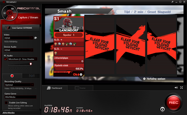 Het startscherm start standaard op met de capture / stream pagina. Link bovenin zit er een wiel met drie verschillende opties: capture stream, media share en instellingen. De capture / stream pagina is verantwoordelijk van het opzetten van je stream, of het opnemen van videocontent. Met de video optie kan je schakelen tussen HDMI en component afhankelijk welk apparaat je aangesloten hebt. Daaronder staat de videokwaliteit en FPS die actief is. Hetzelfde geldt voor de audio optie. Heb je een microfoon aangesloten direct op de GC550 of op de PC, dan kan je deze direct inschakelen. Het volume is te regelen met een slider om deze naar eigen wens in te stellen.
