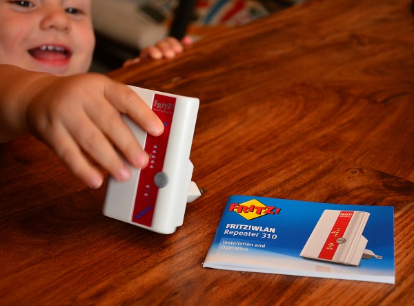 De 310 is beduidend kleiner, en komt ook zonder kabel. Niet vreemd gezien deze geen ethernet poort heeft natuurlijk. De blauwe “remove” letters zijn uiteraard van het beschermend laagje plastic welke je direct kan verwijderen, anders dan de kleinere uitvoering is hij wederom erg herkenbaar vormgegeven en gekleurd. Zoals je ook kan zien verdwijnen er soms wat spullen van de tafel…