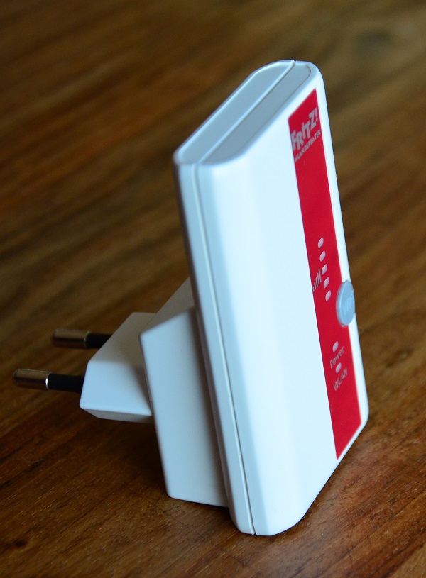 Laten we eerst de 450E bekijken. Naast de repeater krijgen we een mooie platte kabel en een redelijk uitgebreide installatiehandleiding in een flink aantal talen. De repeater is in typische Fritz! kleuren uitgerust: Wit met rode accenten. Het rood is niet knal rood, maar desondanks wel een herkenbaar en aanwezig element. De enkele knop is te gebruiken om WPS verbindingen te maken, de verbinding tijdelijk aan/uit te schakelen, of een reset uit te voeren. Aan de onderzijde zien we de ethernet aansluiting.