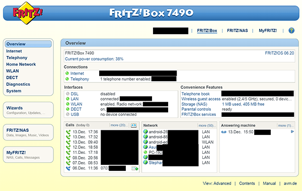 Je bereikt de telefoniecentrale door in je browser naar fritz.box te gaan, of het IP adres van de Fritz!Box in te typen. Uiteraard kom je dan in het ‘overview’ scherm. Hier zien we een overzicht van de verbinding, het netwerk, en de telefonie. Uiteraard moet ik hier en daar wat verbergen, kunnen niet hebben dat iedereen mijn vrouw straks gaat lopen bellen!