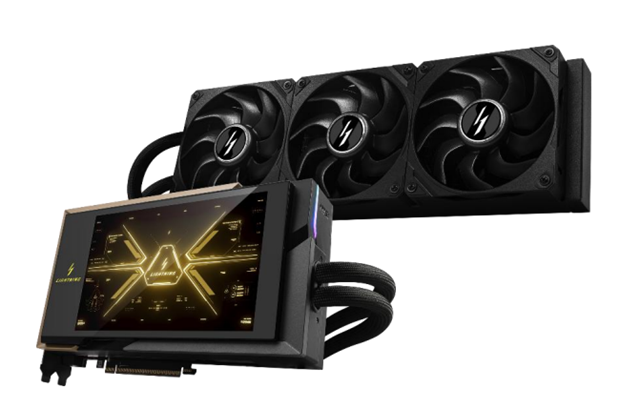 Op het gebied van design en koeling introduceert de LIGHTNING Z baanbrekende innovaties. Een volledig 8-inch display op de voorkant van de kaart stelt gebruikers in staat systeemstatistieken, animaties en artwork volledig te personaliseren. Het liquid-cooling systeem combineert een high-pressure pomp, een full-cover cold plate over GPU, VRAM en MOSFETs, een hybrid-fin radiator met wisselende dichtheid en de geavanceerde Lightning Fan. Samen creëren deze componenten een thermisch ecosysteem dat uitzonderlijke prestaties, optimale warmteverdeling en stille werking garandeert, waardoor de LIGHTNING Z zowel engineering als kunst tentoonstelt.