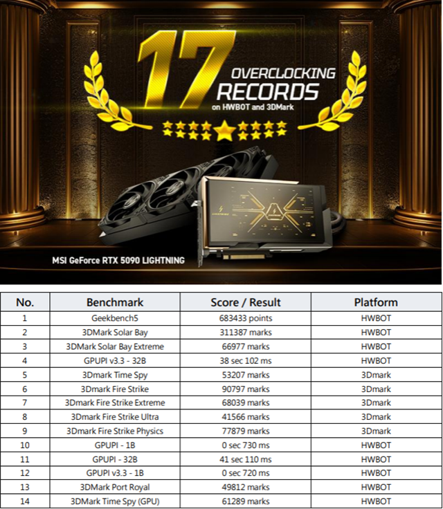 Bij de onthulling bewees de GeForce RTX 5090 LIGHTNING Z direct zijn superioriteit door eerste plaatsen te behalen in zeventien overklokbenchmarks, waarmee meerdere records op HWBOT en 3DMark werden verbroken. Met deze kaart onderstreept MSI zijn reputatie als pionier in extreme prestaties, innovatieve engineering en hoogwaardige graphics-oplossingen voor zowel gamers als professionele creators.