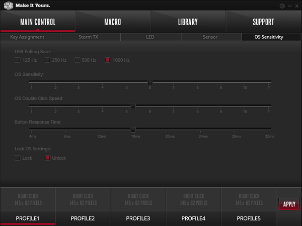 DPI is instelbaar van 50 tot 6400 DPI in stappen van 50 DPI. Ook de lift-off distance is in te stellen van ‘bijna niets’ tot ‘iets meer maar eigenlijk ook niet gek veel’, meer een instelling om aan je oppervlak te fine-tunen. Over tunen gesproken, je kan in de software aangeven welke CM Storm mousepad je hebt om de muis zo een ideale instelling aan te laten nemen. Helaas heb ik geen CM Storm pads in huis om het te testen, maar het klinkt als een mooie en vooral slimme feature. Uiteraard kan je de Sentinel ook gewoon calibreren naar je eigen muismatje. OS instellingen zijn ook aanwezig, en een macro manager ontbreekt ook niet.