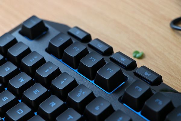 Het Devastator 3 toetsenbord is een rubberdome model, en voelt eigenlijk meer als een soort kantoortoetsenbord met wat hogere keycaps dan een gamer bord. Het verschil in gevoel met bijvoorbeeld een MS120 of een Masterkeys is fors, wat traditionele domes ontbreken de scherpte van mechs en pretend-mechs, maar dan zitten we wederom echt appels en peren te vergelijken. De aanslag is redelijk neutraal, aan de stille kant (in tegenstelling tot de MS120), en vergeleken met de voorgangers lijkt (op basis van geheugen) het font ook iets beter leesbaar zonder verlichting aan.