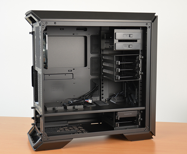 De manier van panelen plaatsen en verwijderen is top, de ‘kiepen’ er uit zonder risico op vallen, en plaatsen ook even eenvoudig terug; prettig voor de ervaren en beginnende gebruiker. Intern zien we de constructie van de MasterCase 5 serie terug, en je kan gerust stellen dat die tot de betere op de markt behoort. Kwalitatief is het een uitzonderlijk sterk frame, de flexibiliteit wordt weliswaar een beetje opgeblazen op de productpagina’s maar feit is dat alle individuele elementen daar aanwezig goed uitgewerkt zijn: verwijderbare donkere laag in het zijpaneel om eventueel voeding en kabels te verbergen, stevige HDD en ODD constructie, solide PSU mount, solide SSD mounts, goede kabel routing opties, en nogmaals de interne bouw is echt top.