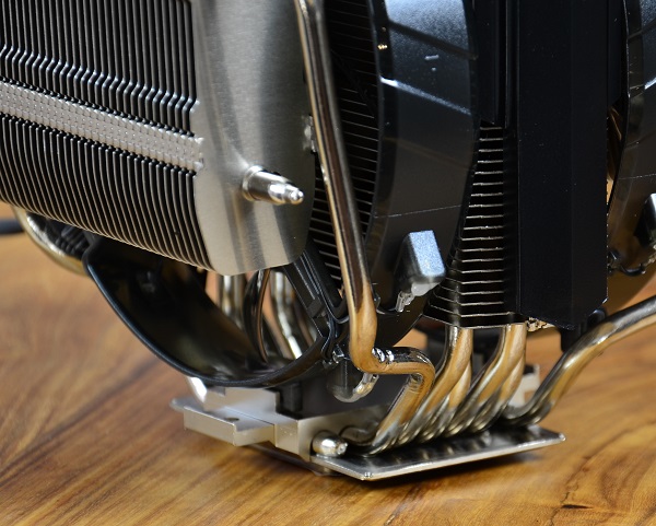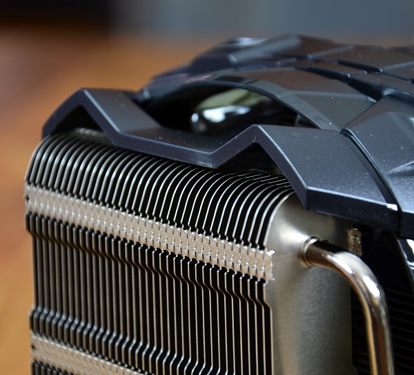 Wat moet ik van de V8 zeggen? Het is een gigantisch ding met een extreme uitstraling vanwege de vele zwarte plastic elementen en de opvallende ventilatoren. De ventilatoren hebben overigens een aparte constructie, waardoor je zeker niet ‘zo maar’ even andere ventilatoren kan plaatsen, hou daar rekening mee als je dat van plan was. Alles lijkt te duiden op ‘form over function’ en een doelstelling om een kleine doelgroep die iets extreems wil laten zien aan te spreken. Toch lijkt de V8 prima in elkaar te zitten, want alles voelt stevig aan, de heatpipes zijn fors en de koelvinnen zijn stevig en degelijk afgewerkt; een budget koelertje met een hoop poeha is dit zeker niet.
