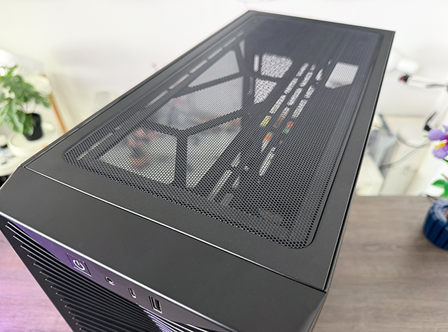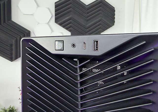 USB-C op het frontpaneel zien we graag, al zien we hier ook de eerste besparing: slechts een enkele USB-A poort, en dan nog in USB 2.0 specificatie ook. Verder zien we aan zowel de bovenkant als de onderkant een eenvoudig magnetisch stoffilter. Als je luxere cases gewent bent mis je dus een wat luxer systeem om die goed te onderhouden.