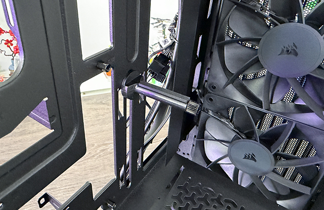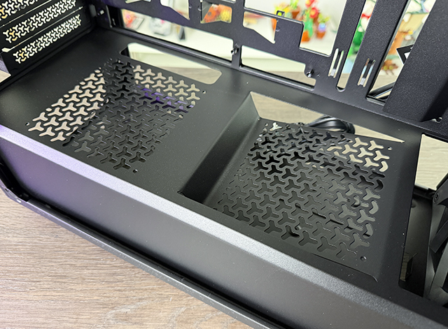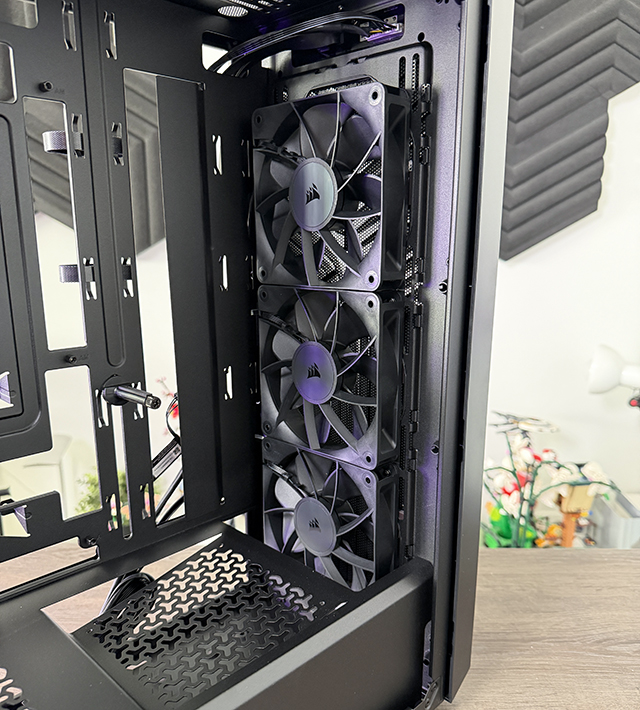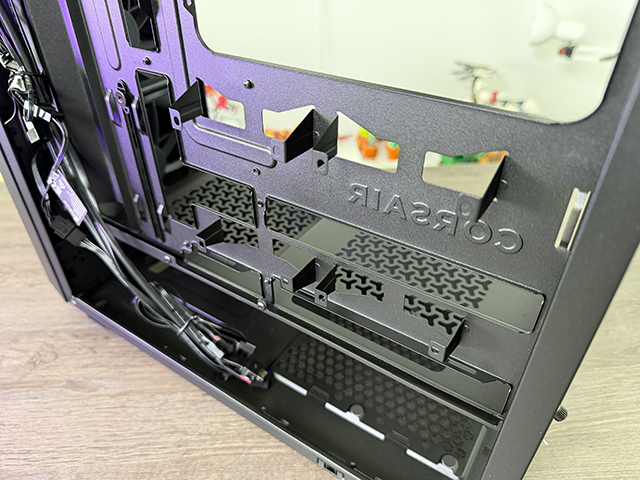 Ook de PSU cover valt op met het inmiddels bekende Corsair patroontje, en de optie is aanwezig om een extra fan direct op je GPU te zetten.
