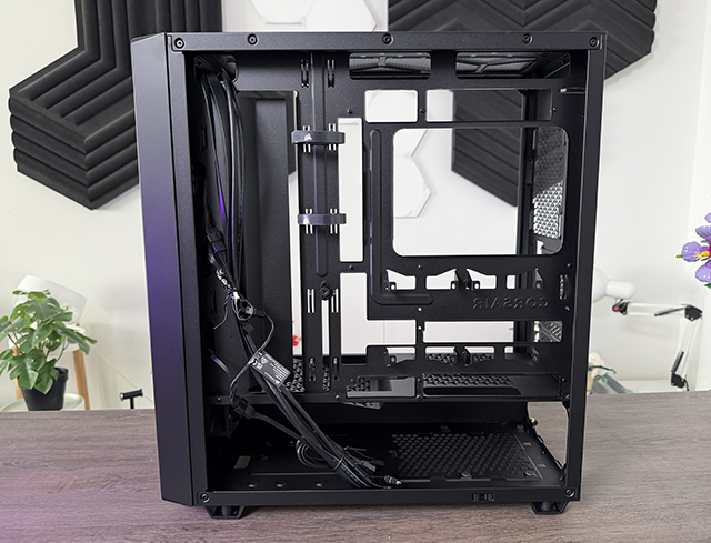 De volgende besparing wordt duidelijk bij het loshalen van de panelen, die zijn relatief dun metaal. Dat is iets waar we de Frame 4000D billenkoek voor gaven, iets dat Corsair inmiddels heeft verbeterd, maar hier dus wel merkbaar is. Intern zien we drie stevige RS ventilatoren aan de voorzijde, dat zijn bovengemiddeld luxe fans in dit segment. Wij hebben het zwarte model, maar een versie met aRGB bestaat ook, net als een witte uitvoering.