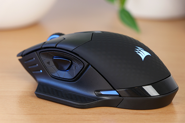 Waar de draadloos ladende concurrentie redelijk terughoudend zijn met de knoppen gaat Corsair stevig los. We zien twee duimknoppen met een sniper knop in het midden, plus nog twee extra knoppen aan de linker kant. Wil je veel knoppen en draadloos laden dan heeft Corsair een streepje voor.
