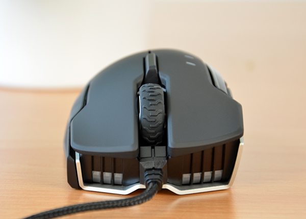 De Corsair Glaive RGB is gewoon een indrukwekkende muis. In mijn optiek helpen de aluminium elementen van die specifieke versie daarbij, maar ik twijfel er niet aan dat hij in geheel zwart niet noemenswaardig minder knap zou zijn. Hoewel grotendeels plastic voelt alles gewoon prima stevig, en de grove lijnen en groeven in het muiswiel doen mij vermoeden dat ze een samenwerking zijn gestart met CAT. Het is bijna lastig om aandacht te vragen voor één specifiek onderdeel.