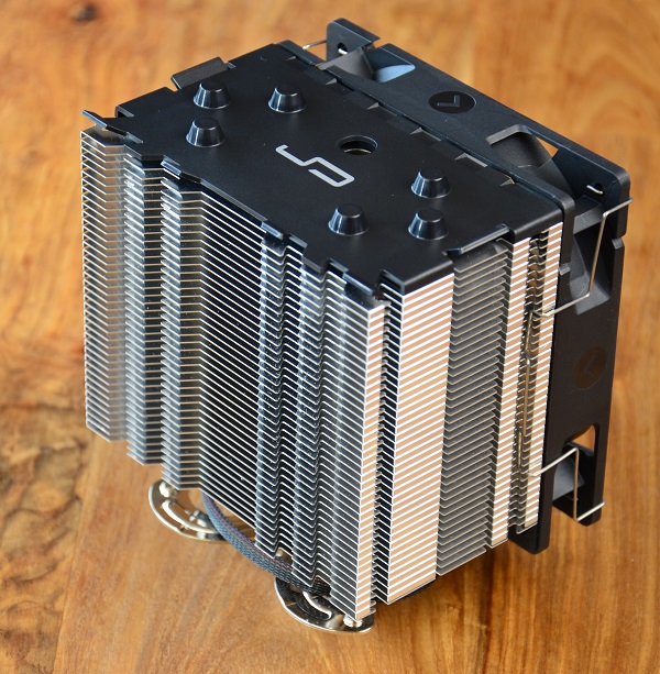 Aan de zijkanten zien we de zes koperen heatpipes voorzien van een laagje nikken. Deze lopen door het koelblok, waarna vier van de zes heatpipes doorlopen en contact maken met een wat kleiner zwart gesloten koelblok net onder het hoofdblok. Een aparte indeling, en je ziet er na installatie niets van, maar mooi is het wel.
