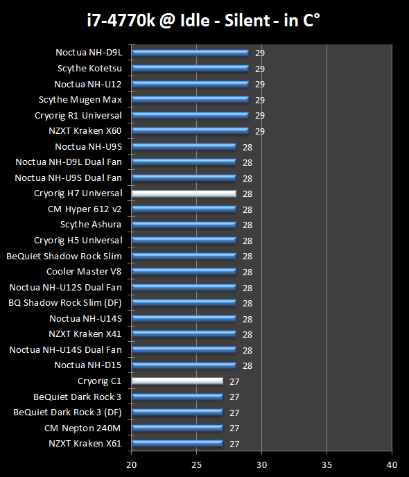 De meer gangbare Cryorig H7 Universal blijft in dezelfde regionen hangen, nipt achter de iets forsere (en duurdere) directe concurrenten maar voor de nog compactere Noctua’s en de budget Kotetsu. De Kotetsu is weliswaar goedkoper, maar wat afwerking en uitstraling betreft een paar klasses lager. Een prestatie in lijn met de verwachtingen.