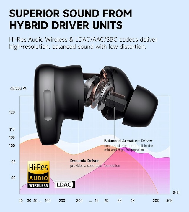 De NeoDots biedt Hi-Res Audio Wireless-certificering en ondersteunt LDAC, AAC, en SBC-codecs voor nauwkeurige weergave op verschillende apparaten. De hybride actieve ruisonderdrukking vermindert omgevingsgeluid tot -48dB, met aanpasbare modi voor diverse omgevingen.