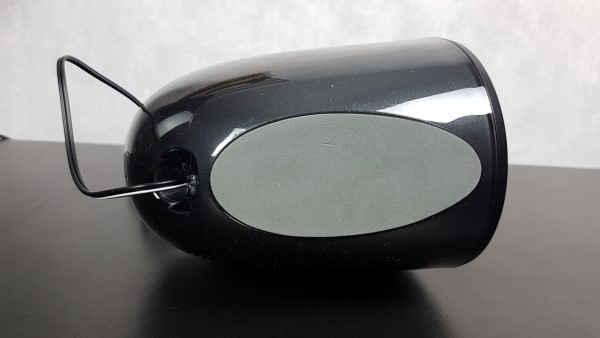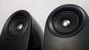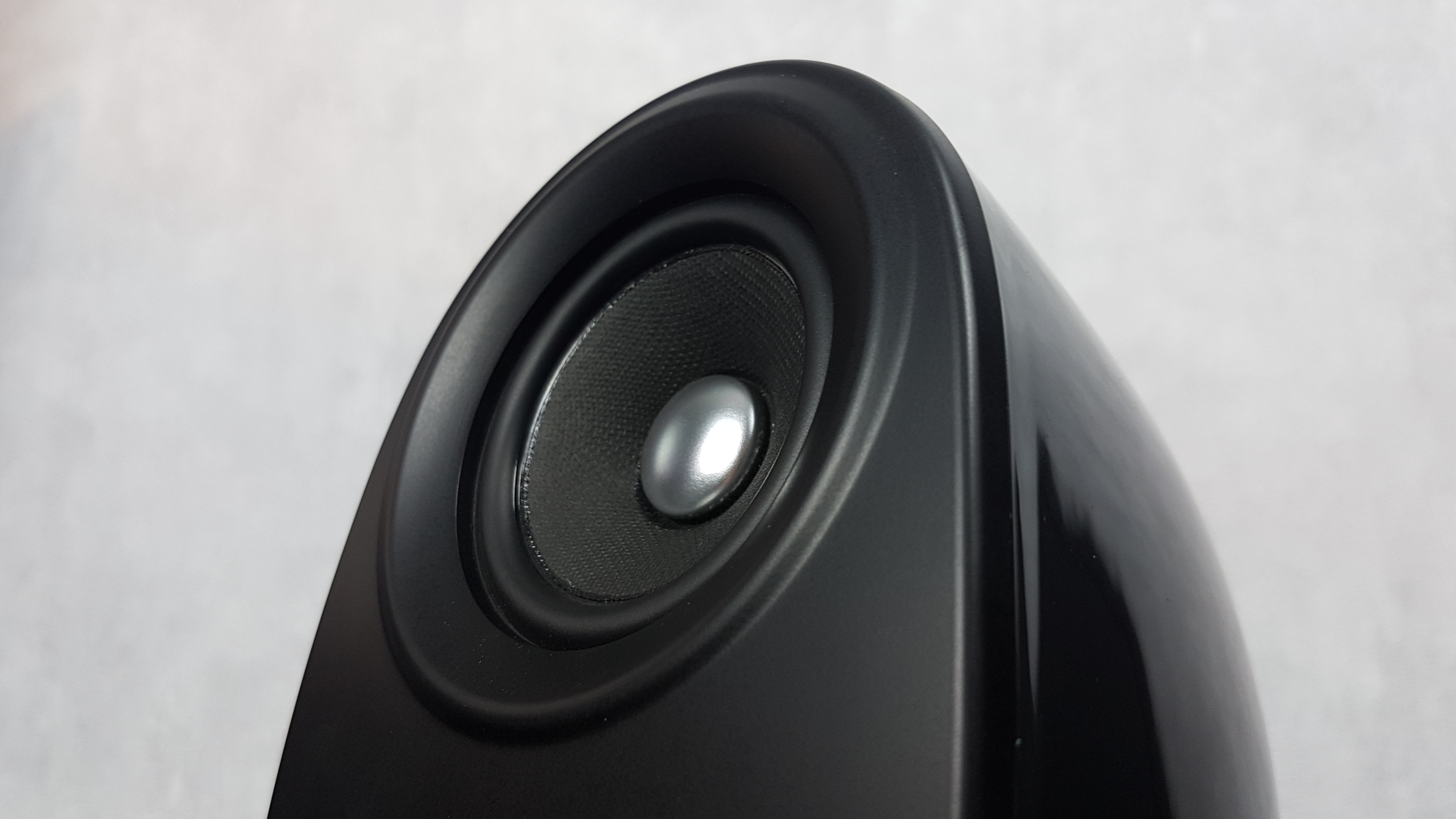 Verder naar de twee losse satellieten die er door hun ronde vorm erg leuk en stevig uitzien. Ze zijn dan wel niet zo groot (180mm hoog) maar zien er toch erg robuust uit. De foto geeft een iets vertekend beeld, maar ze hebben een mooie ovale vorm. Het materiaal aan de voorkant is van kwalitatief kunststof gemaakt. De zijkanten zijn een heel ander verhaal, er lijkt een doorzichtige laag over de speaker gegoten te zijn die een erg gave weerspiegeling geeft. Glas is het niet, maar stevig is het wel zeker.