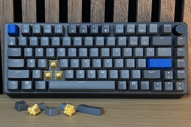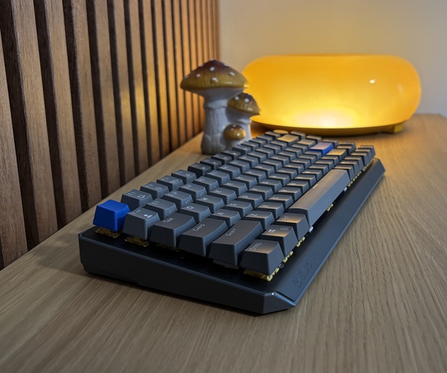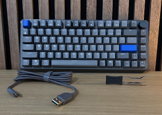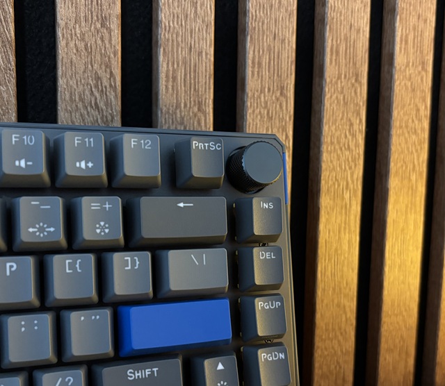 Ik ben zelf een groot fan van compacte toetsenborden en het 75% formaat is wat mij betreft de perfecte middenweg. Je houdt genoeg toetsen over om productief te blijven, maar wint veel ruimte op je bureau. Een leuk detail is dat je extra keycaps krijgt. Standaard zijn de escape en enter toetsen blauw, maar als je dat niet mooi vindt kun je ze gewoon omwisselen met de meegeleverde grijze exemplaren. De keycaps zijn van double shot PBT, wat betekent dat ze slijtvast zijn en niet snel glimmen, zelfs niet na langdurig gebruik.