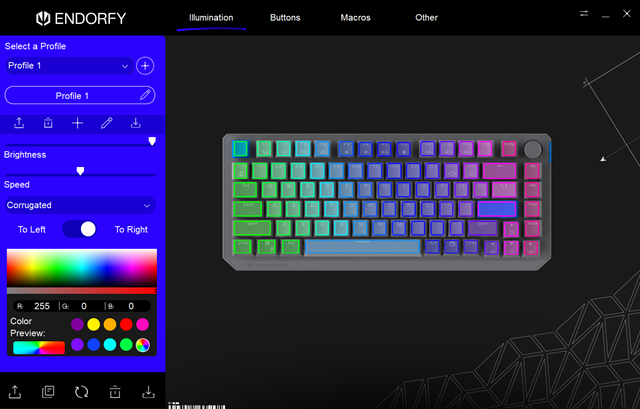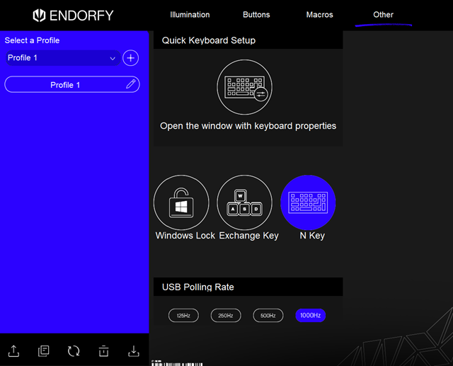 Wat ik ook sterk vind is dat je bij dit compacte bord niets hoeft te missen. Alle mediafuncties zitten slim verwerkt in de F-toetsen en zijn te bedienen via de FN-knop (met het Endorfy-logo erop). Zo kun je eenvoudig je volume aanpassen, nummers skippen of de RGB bedienen. Wil je toch meer controle, dan kun je dat ook via de ENDORFY Keyboard Software doen.