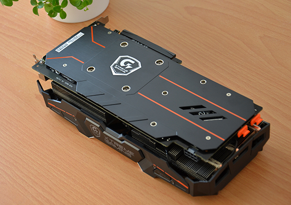 Gelukkig maar dat de kaart zelf zo ontzettend veel goed maakt. Met twee 10cm ventilatoren is het niet het meest lange beest, maar hij is toch indrukwekkend genoeg, al was het maar vanwege de 2,5 slote n die hij inneemt. Ik zal toegeven dat ik persoonlijk wel fan ben van stevige kaarten die niet overdreven lang zijn, ook vanwege het mindere doorhangen op typische moederborden, maar een beetje formaat is wel handig voor dat ‘echte dikke GPU gevoel’ wat her volgens mij niet ontbreekt.