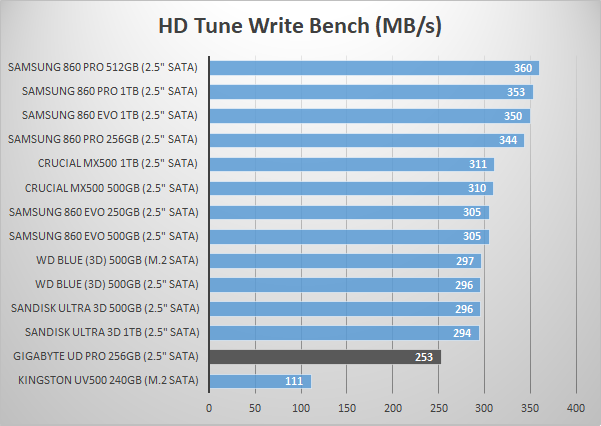 Afhankelijk van de benchmark varieert het een beetje van “erg goed” tot “budget-tot-mid-range drive”, waarbij we wel moeten opmerken dat kleinere capaciteiten het altijd wat lastiger hebben dan de 500GB en grotere units en Gigabyte dus vermoedelijk wat beter af was geweest met de grotere variant dan deze kleine. Zo zijn we op zich positief gestemd over hoe de kleinere UD PRO het doet vergeleken met de 500GB versie van de WD Blue of Sandisk Ultra 3D, twee modellen die een aardig voorbeeld van een middenklasse drive zijn. Ook vergeleken met de 500GB versie van de MX500 zien we dat Gigabyte hier en daar wel een puntje laat liggen, vooral als het op schrijven aan komt, maar bij het lezen die strijd toch met overtuiging weet aan te gaan; dat geeft op zich goede hoop voor de 512GB variant van de UD PRO die normaliter toch nog wat beter moet presteren dan deze. Aan de andere kant moeten we kritisch en duidelijk stellen dat de 860 EVO, ook de 250GB versie, structureel de stabielere performer is, waarbij vooral de PC Mark 8 score en specifieke write-benchmarks een groot gat laat zien.