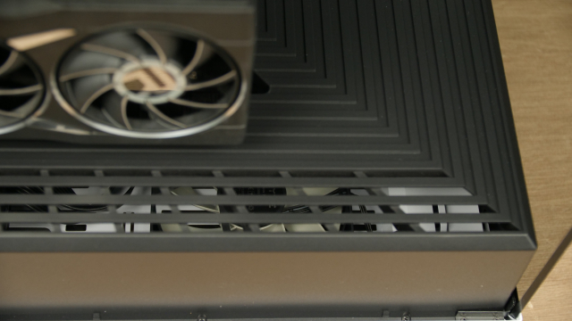 Iets wat speciaal is Y40 het alleen mogelijk is om een GPU verticaal te instaleren, tot zelfs 4 slots dikke kaarten waarbij zelfs ruimte blijft andere half hoge PCIe uitbreidingskaarten. Normaal gesproken zorgt dit in combinatie TG zijpaneel ervoor dat GPU niet zo goed kan koelen maar HYTE heeft hiervoor een slimme oplossing bedacht. Er zijn namelijk ventilatiesleuven aangebracht in de PSU shroud onder de vertical mount, deze wordt door middel van een voor geïnstalleerde fan voorzien van een constante aanvoer van verse lucht.