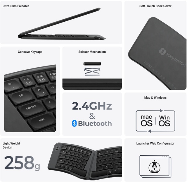 Op het gebied van connectiviteit ondersteunt de B11 Pro zowel 2,4 GHz draadloos als Bluetooth 5.3. De ingebouwde 250 mAh-accu zou volgens Keychron tot circa 135 uur gebruik per lading mogelijk maken. Een geïntegreerde sensor detecteert wanneer het toetsenbord wordt dichtgevouwen en schakelt het apparaat automatisch uit om energie te besparen.