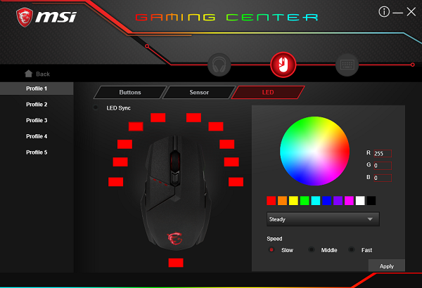 De MSI muis software, Gaming Center, scoort prima op gebied van functionaliteit. Profielen, knoppen aanpassen, prestaties aanpassen tot in redelijk detail, LEDs aanpassen, de meeste gangbare zaken zijn netjes aanwezig. Wel voelt de implementatie wat oubollig en eenvoudig uitgevoerd, want een fancy pakketje is het zeker niet en merken als Corsair, Razer, Logitech of Roccat lopen op gebied van software ervaring een paar stappen voor.