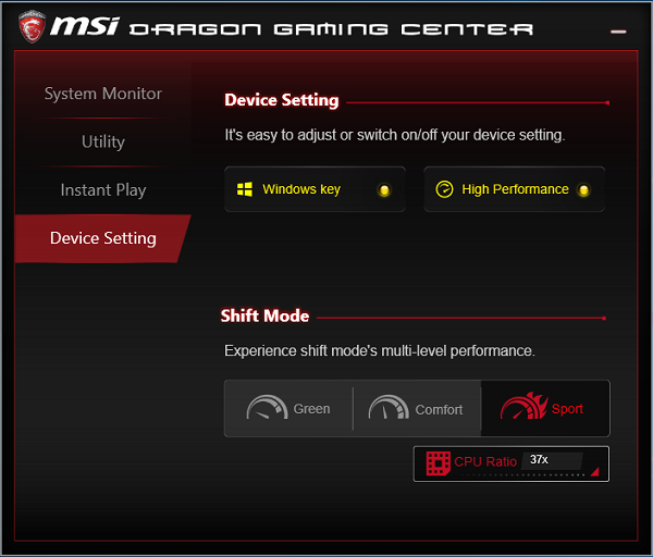 MSI levert de laptop met een flink softwarepakket. Naast de SteelSeries bundel voor je toetsenbord vinden we bijvoorbeeld het “MSI Dragon Gaming Center”. Waarom het zo’n absurde naam heeft? Dat moet je mij niet vragen, maar consistentie ontbreekt een beetje gezien de snelheidsstanden van de processor meer van auto’s weghebben dan van draken: Green, Comfort en Sport. Tevens kan je daar op eenvoudige wijze je processor iets overklokken.