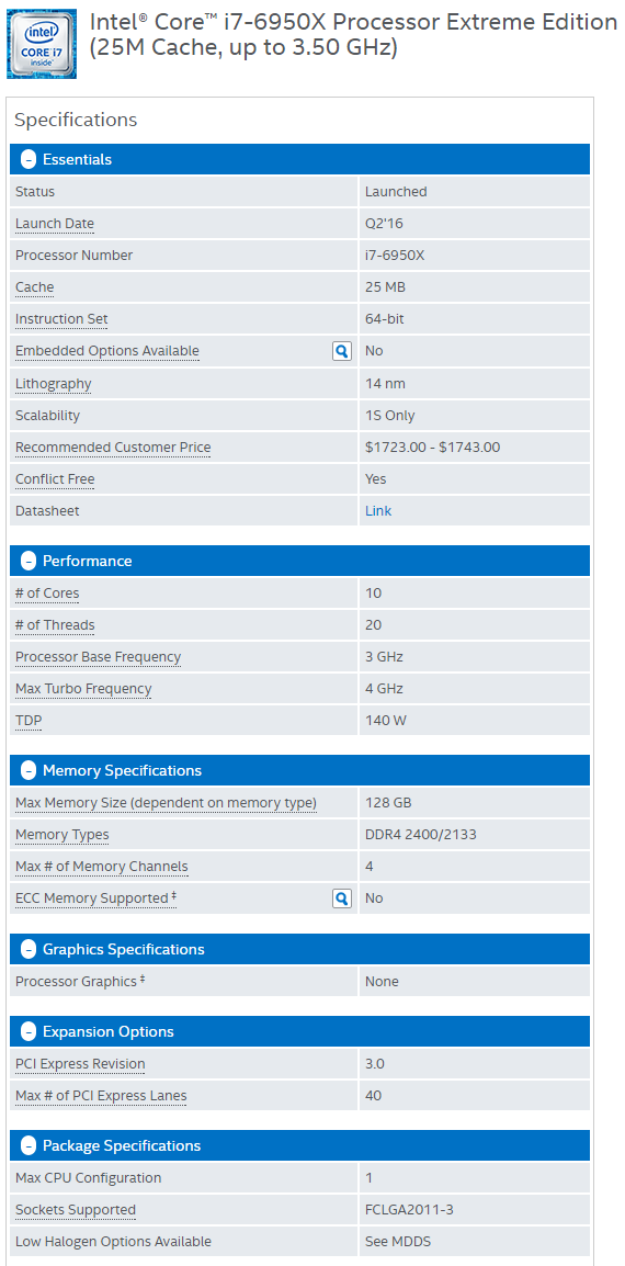 De kenmerken en specificaties De Intel Core i7-6950X: