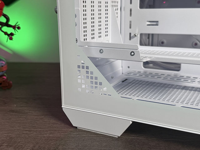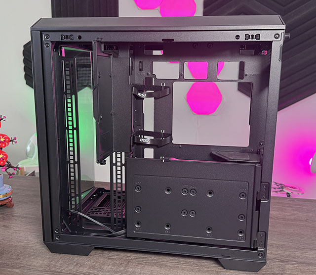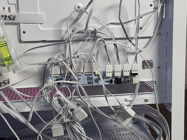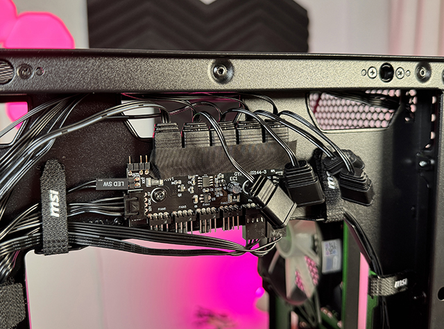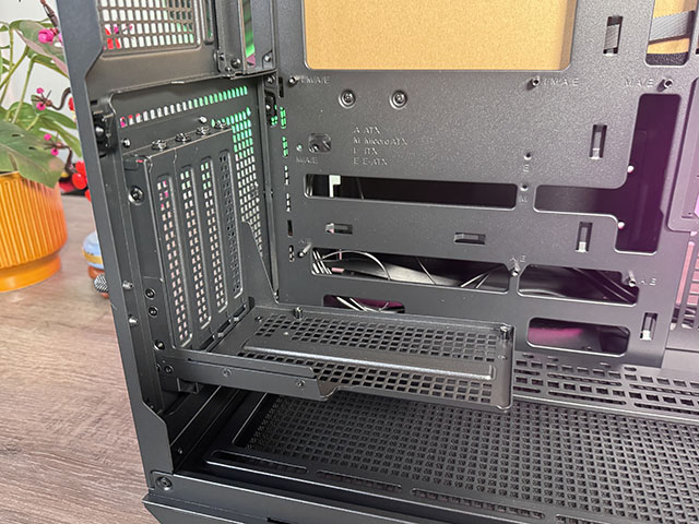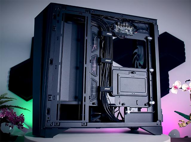 Hoewel deze Gungnir 300R Airflow niet heel veel unieks doet combineert hij wel features die de meeste mensen weten te waarderen. Zoals het feit dat ook hier de fan- en RGB hub bij zit, dat je zelf kan kiezen of je fans erbij wilt of niet, en hier zit ook een lekker opvallende GPU holder bij. Die laatste feature zien we niet altijd bij MSI, al lijkt dat te maken te hebben met het feit dat MSI die bij hun videokaarten levert. Ze lijken er gemakshalve dus vanuit te gaan dat wanneer je een MSI case koopt je ook wel een MSI videokaart hebt, een gedachte waar ik mij wel een beetje in kan vinden.