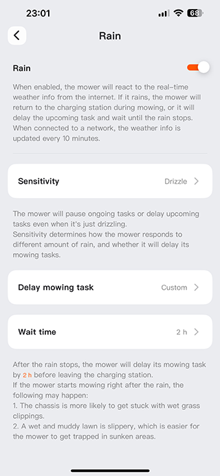 En ook op andere punten beviel het “slimme” uitstekend. Het feit dat ik hem via de wifi kan beheren in plaats van de tuin in moet lopen als het regent, of het feit dat hij zelf op basis van aanstaande regen weet zich gewoon even te parkeren. Het gebruiksgemak van dit model ten opzichte van wat wij gewend waren is echt top.