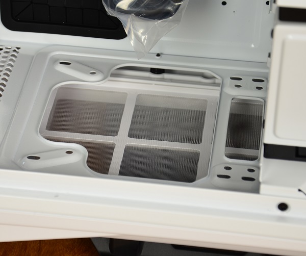 De binnenkant is een vrij traditionele toren. Wel keurig wit meegespoten, zwarte kabels, zwarte rubberen grommets in de kabelmanagement gaten, een keurig passende 140mm ventilator achterin, rubberen voetjes voor de voeding, en wederom een stoffilter aan de onderzijde (mocht je het nog niet doorhebben, alles is gefilterd). Eigenlijk ziet alles er tip top in orde uit, al ontbreekt bijvoorbeeld de PSU cover zoals we die in sommige recente behuizingen (waaronder NZXT hun eigen H440) hebben gezien.