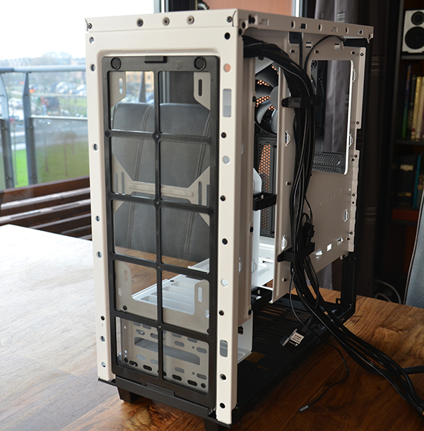 Als je een waterkoeler wilt inbouwen zoals de NZXT Krakens dan beginnen we natuurlijk door de panelen er af te halen. Achter het voorpaneel treffen we een groot magnetisch stoffilter aan, en zonder panelen zien we aan alle kanten voldoende ruimte om te knutselen. Wij hebben een Kraken X52 ingebouwd, maar zoals je ziet kan een X62 ook aan de voorzijde. Bovenin of achterin is geen plaats voor deze zware jongens.