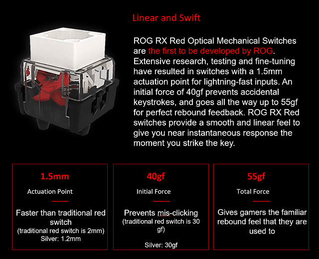 De ROG RX switch is verkrijgbaar in twee varianten, de lineaire rode switch, en de clicky blauwe switch: