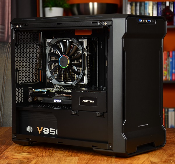 De Evolv ITX richt zich dus wel wat meer op de budget-alerte gebruikers: Mensen die wel een tof systeem willen, maar niet te veel willen investeren in luxe extra’s. Een klein ventilatortje erbij hoeft zeker geen relevante investering te zijn (maar is wel absoluut de moeite waard als je een wat zwaarder systeem wilt bouwen), en je kan ook prima besparen op bijvoorbeeld een goedkopere (niet modulaire, minder luxe kabels) voeding omdat de kabels toch verborgen kunnen worden. Ook de ruimte voor het plaatsen van componenten is extreem voor een ITX kast: Geen noodzaak voor duurdere ITX grafische kaarten, praktisch geen beperking bij je processorkoeler keuze (oftewel een betaalbare towerkoeler is prima bruikbaar) en genoeg HDD ruimte voor een typische game-pc. Mocht je voor de volledige (custom) waterkoeling setup gaan dan kan je aardig uit de voeten, want in deze prijsklasse is de Evolv ITX duidelijk de baas wat radiator-opties betreft in een redelijk compacte vorm; typisch een Phanteksje dus. Wat je wel moet missen is een eventuele optische drive of fancontroller, daar is geen ruimte voor, en uiteraard betaal je voor al deze inbouwopties met bovengemiddeld grote afmetingen.