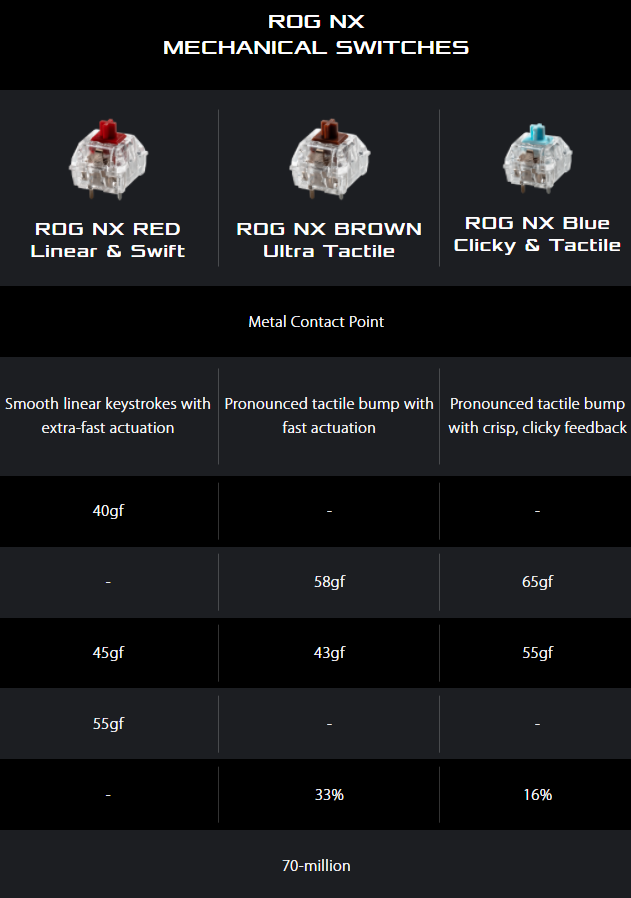 ROG NX Blue: ROG NX Blue mechanische schakelaars hebben een activeringspunt van 2,3 mm, een standaard klikverhouding van 16% en een door liefhebbers geprefereerde tactiele kracht van 65 gf – allemaal om stevige en uitstekende feedback te geven bij elke toetsaanslag.