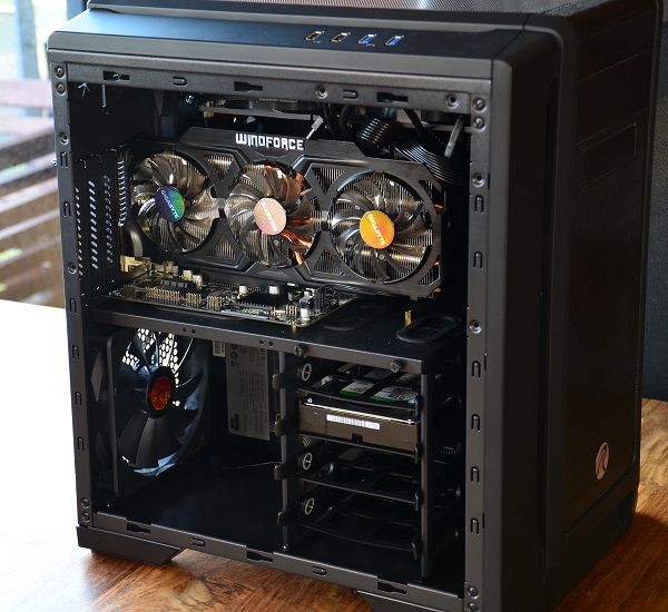 Als laatste nog een dikke GPU er in, en klaar. Nu heb ik gekozen voor een gesloten variant dus hoef ik kabelmanagement niet heel nauw te houden, maar zoals je op de foto kan zien zie je zelfs zonder aandacht (De foto’s zijn pre-kabel-aandacht!) al praktisch geen kabels meer. Met een klein beetje liefde zorg je in een paar minuten voor een strakke build. Punten voor presentatie dus! Wel is het aan te raden te kiezen voor een moederbord met zo veel mogelijk aansluitingen aan de zijkant, en niet aan de ‘onderkant’ van het bord. In dat geval maak je het namelijk wat lastiger om de kabels helemaal uit het zicht te houden, de windowed Aeneas heeft tenslotte een praktisch geheel doorzichtig zijpaneel. Overigens is er hier en daar ruimte genoeg tussen de hardware in, dus een SSD kan je zo ergens tussen verbergen om 4x 3.5” drives kwijt te kunnen.
