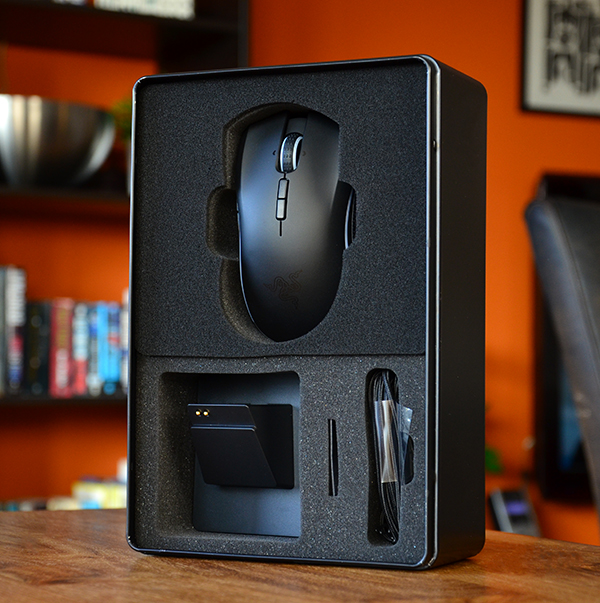 De Mamba lijkt wat kort op de foto, maar dat is optisch bedrog. Hoewel niet overdreven groot is het voor een gemiddelde hand een mooie handvullende vormgeving, uiteraard wel enkel voor rechtshandigen. De muisknoppen zijn wat gebogen waardoor je vingers praktisch vanzelf op de juiste plek vallen, en aan de voorkant zien we als we goed kijken de USB aansluiting in het geval dat je de muis in bedrade modus wilt gebruiken, hiervoor gebruik je dezelfde kabel die in je docking station gaat. Hoewel Razer nog wel eens bekend staat om erg opvallende producten is de Mamba eigenlijk meer een bescheiden kracht die het moet hebben van een strakke vormgeving en nette afwerking, echt over de top elementen zijn er niet, maar als hij voor je neus ligt is het gewoon genieten.