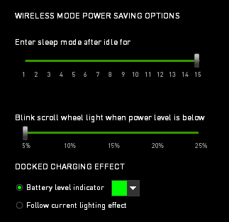 Hoewel je bedraad kan werken wanneer de accu leeg is kan het geen kwaad energie te besparen. Zo kan je de muis vanzelf in een slaapstand laten gaan na x minuten geen activiteit, en je kan om jezelf aan het batterijniveau te herinneren de verlichting van je scrollwiel te laten knipperen wanneer de batterij onder een bepaald percentage is. Tevens kan je het docking station als batterijindicator gebruiken. In de standaard instelling is deze bijvoorbeeld groen wanneer de muis aan het laden is.