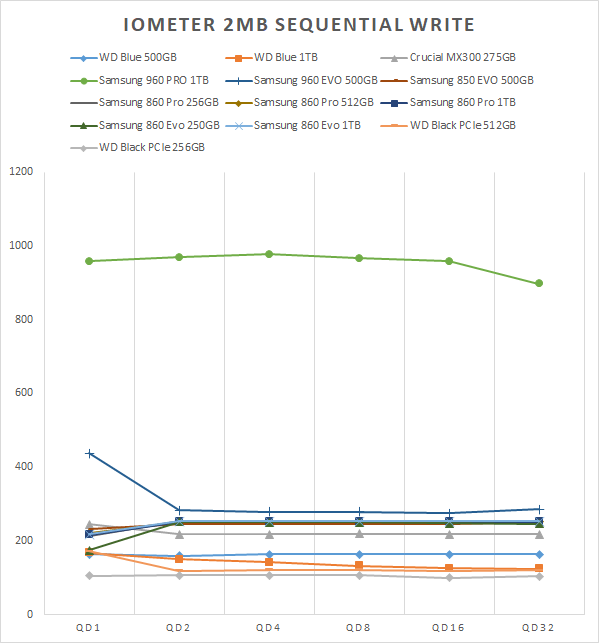 Tja. Voorop: Alle Samsungs laten de rest achter zich, in dat opzicht heeft Samsung echt een duidelijk streepje voor vergeleken met de meeste andere drives, inclusief wederom de NVMe WD Blacks. Maar het gehoopte gat tussen PRO en EVO? Dat is lastiger zoeken. Die vinden we weliswaar al bij QD8 en QD16, in de onderstaande grafiek zie je dat iets beter, maar dat komt vooral omdat we in de standaard test de 860 EVO 1TB stiekem al een drop zien maken in een tot dan stijgende lijn. We zien dat de controller de cache van de EVO veelal weet te benutten om ogenschijnlijk even snelle drive neer te zetten, maar er zijn wel wat momentjes waarop de onderliggende ‘betere’ geheugencellen van de PRO net wat consistenter zijn.