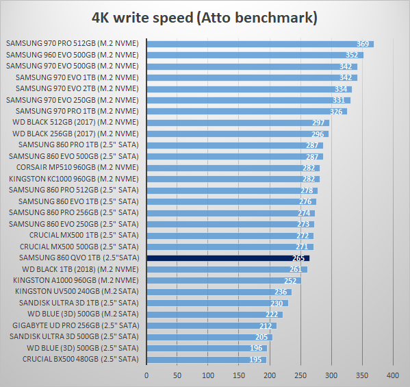 Samsung is echter niet gek geworden, want de 860 QVO is wel degelijk goed doordracht en aan de andere kant zien we juist een paar opvallend goede benchmark resultaten. Vooral door de macht van veel opslag en een beetje vlotte cache handig in te zetten zien we dat de 860 QVO op de meeste praktische benchmarks eigenlijk heel goed scoort. Vooral de voor de de meeste gebruikers 4K read en write resultaten doet hij het echt uitstekend en hikt hij tegen drives als de MX500 en zelfs de 860 EVO aan. Andere budget drives zoals de Kingston UV500 of A1000, of Crucial’s BX500, laat hij toch echt ruim achter zich waar het voor de meeste gebruikers zal tellen. Samsung moet het dan wel hebben van wat meer vrije ruimte om die prestatie in stand te houden bij zwaardere taken, maar voor eenvoudige zaken als systeem, applicaties of games starten? Een prima alternatief.