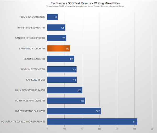De T7 Touch doet het logischerwijs prima als USB 3.2 drives, met rappe beyond-SATA transfers. De prestaties in de tests met meer kleine files zakken echter iets terug ten opzichte van o.a. de Sandisk Extreme Pro, en ook in PC Mark 8 is dat zichtbaar.